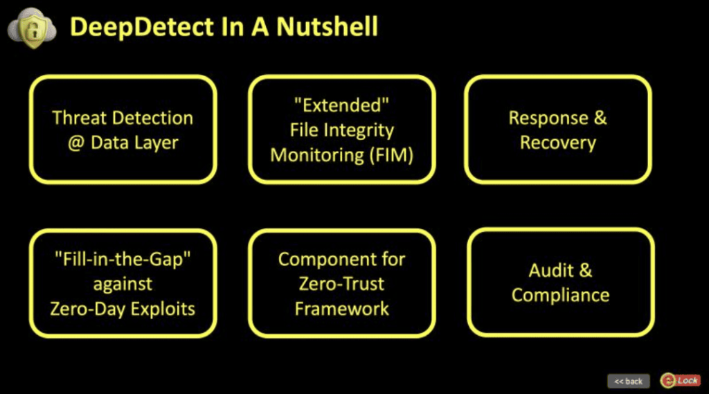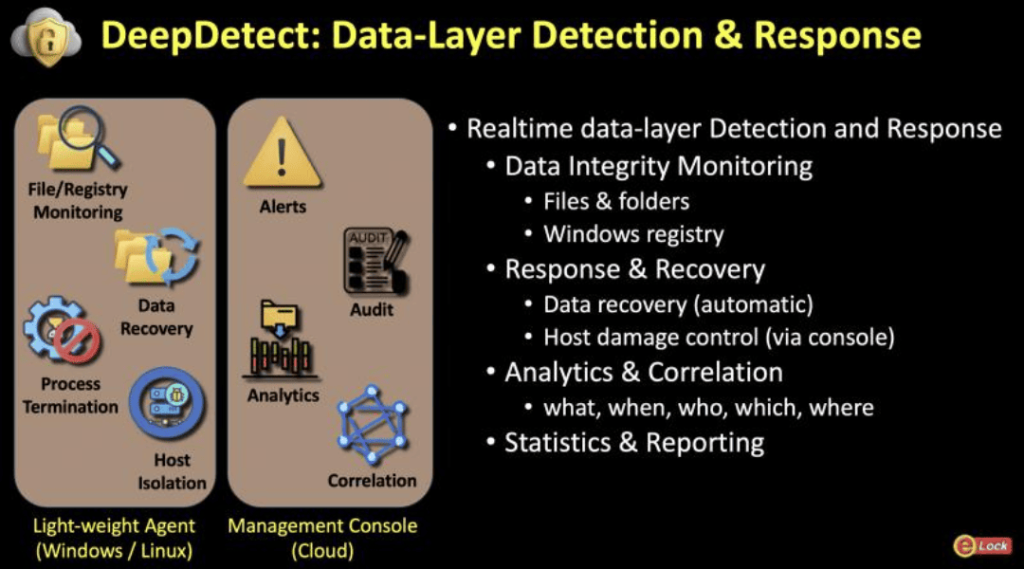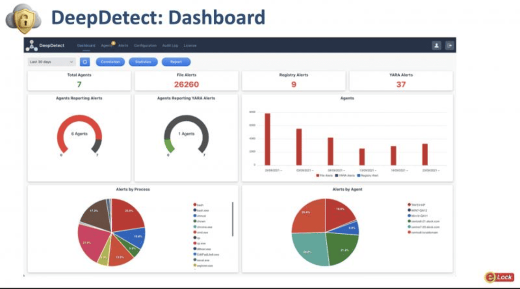 e-Lock DeepDetect uses AI and deep learning to detect known and unknown cyber threats, anomalies, insider risks, and APTs across enterprise environments, delivering actionable insights for faster response, reduced dwell time, and stronger resilience.