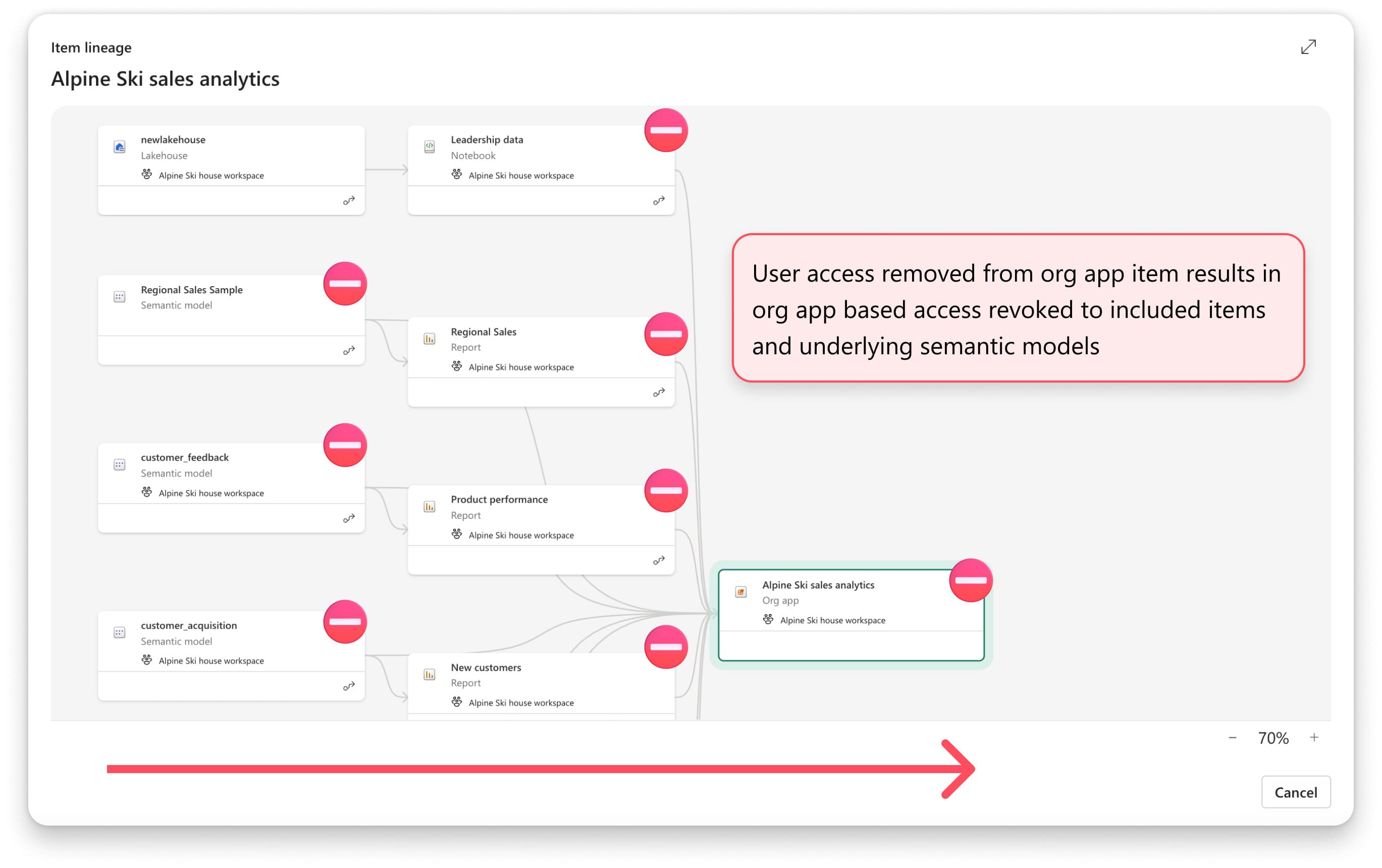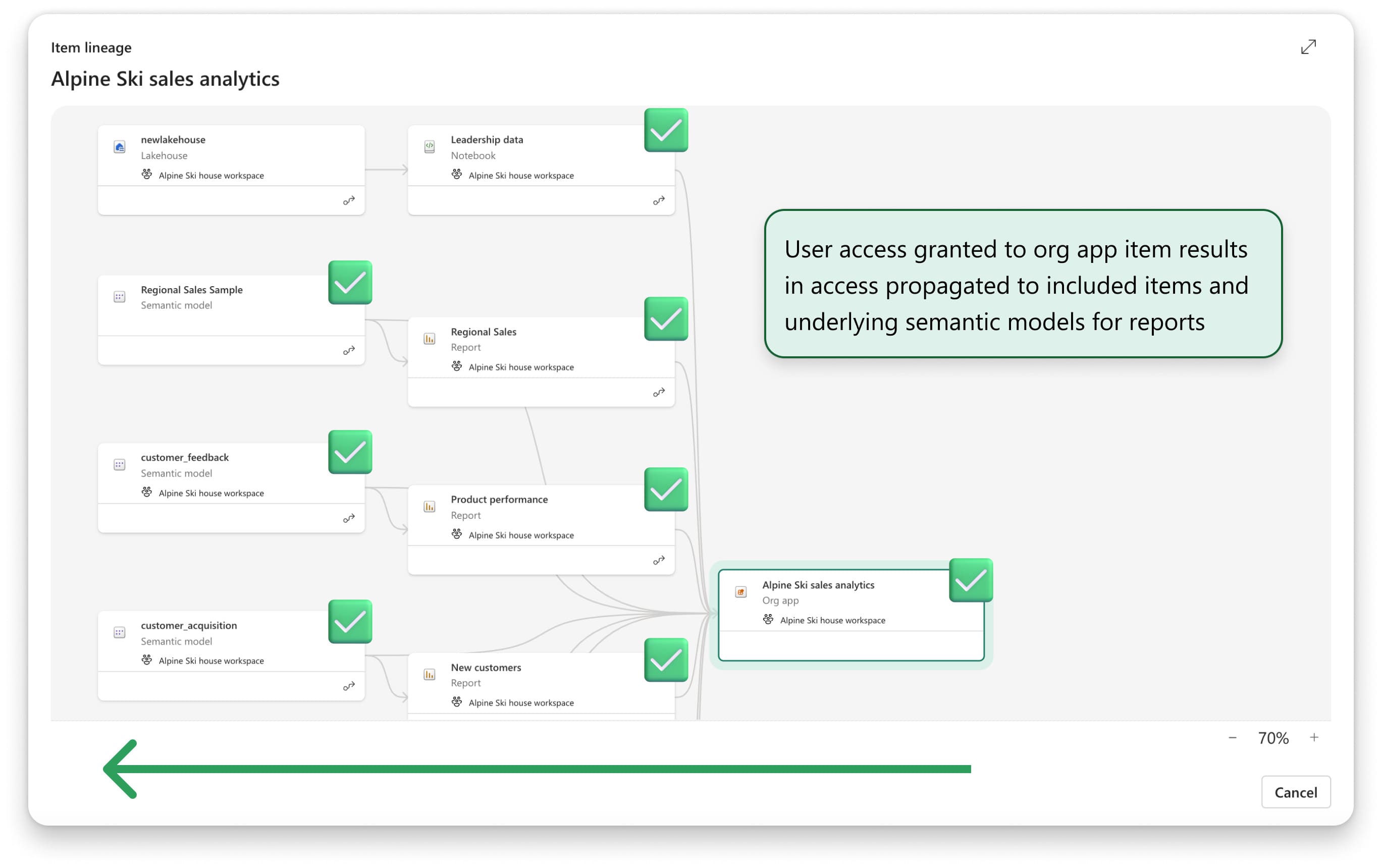 Propagation of access to underlying semantic models across workspaces. Org app users automatically get access to the items you’ve included in your org app, like reports, plus any underlying semantic models in the same workspace, and now with org apps, another workspace: