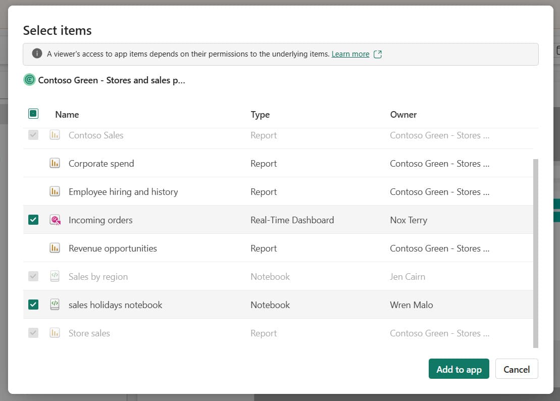 - Add your report, notebook, or real-time dashboard items from Add content