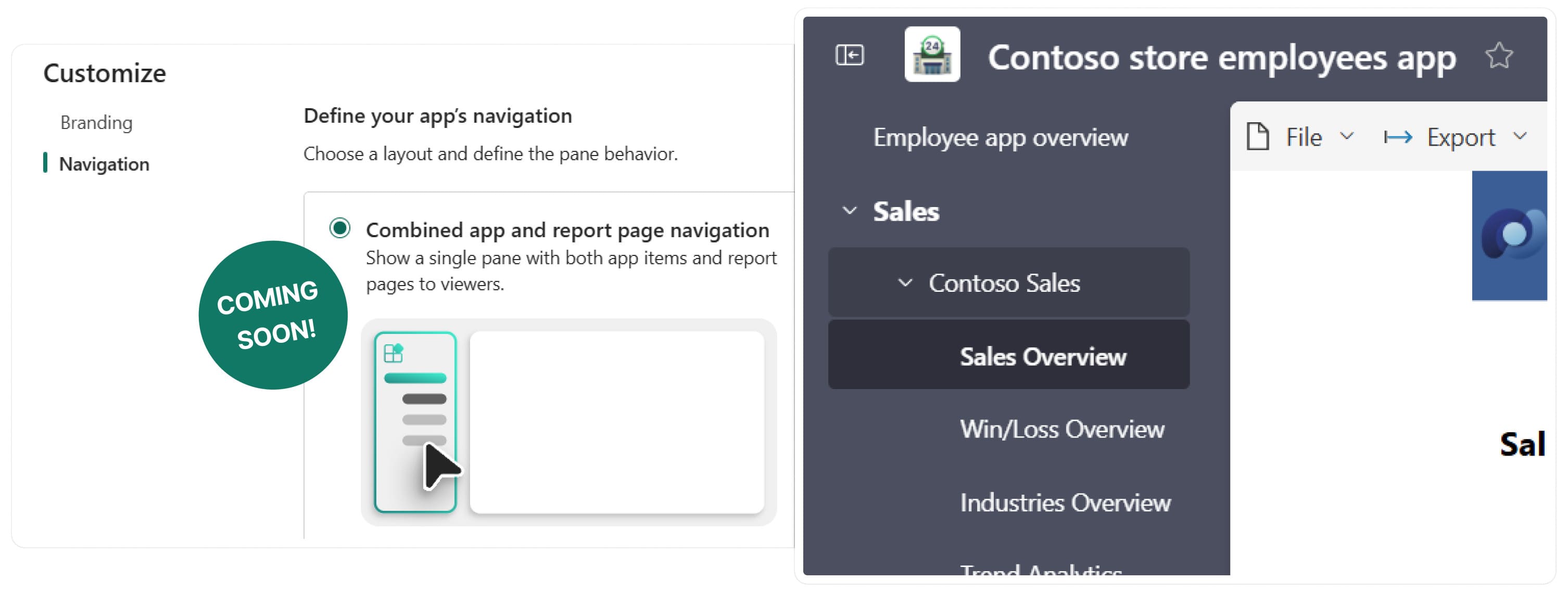 What’s next for customizing org app experiences? You’ll have an additional nav option soon, we’re working on adding the combined nav experience. In the combined nav experience report pages fold into the org app nav like seen in workspace apps today, here’s a small sneak peek: