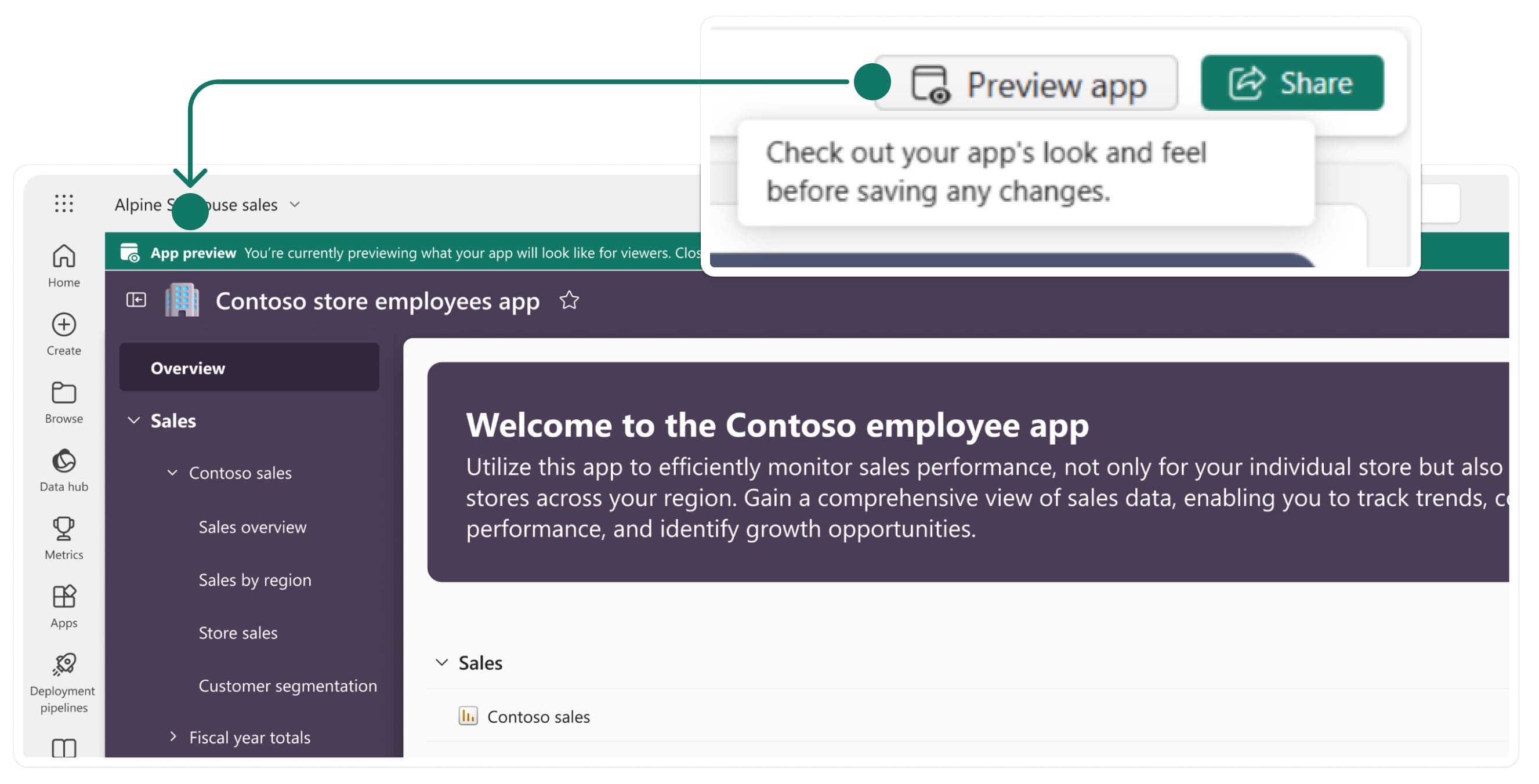 - Preview your org app, Save, and Share