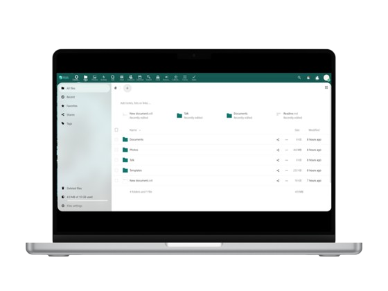 Centralized file storage with folder management, version control, sharing permissions, and secure access.